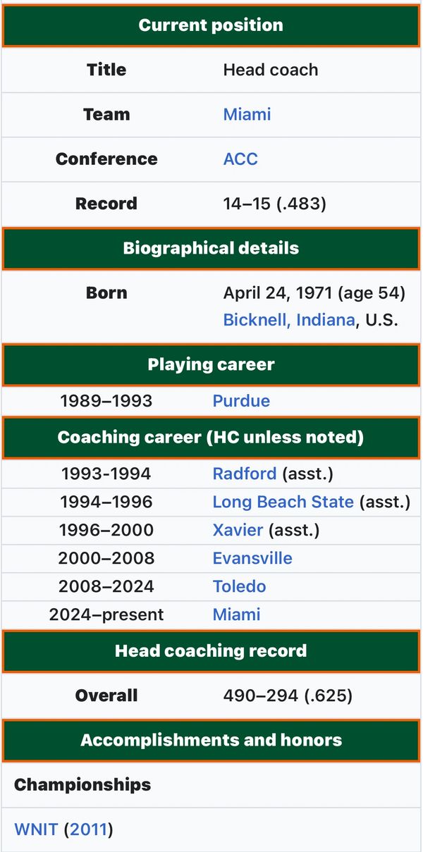Tricia Cullop (born April 24, 1971) is the current head coach of the Miami Hurricanes Women’s Basketball team. She previously was the head coach with the Toledo Rockets Women’s Basketball team.